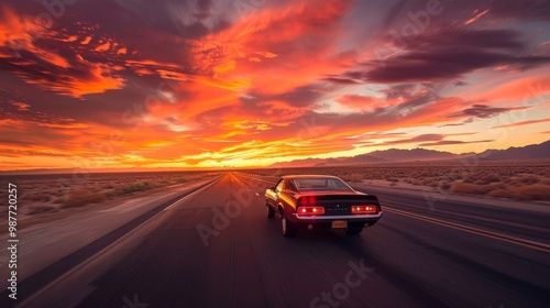 Highway to freedom an american muscle car racing towards a stunning sunset in the desert