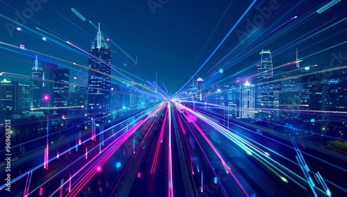 Highway with city lights in the background, with digital connections and data flowing across it, smart city with abstract polygon pattern and speed light lines, big data connection technology concept