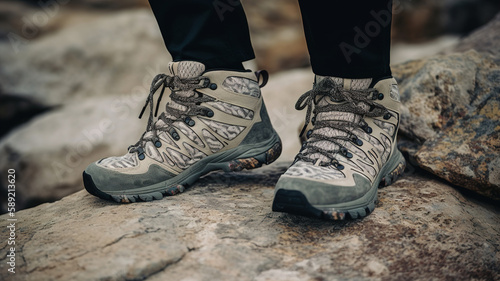 Hiker standing on a rock in mountains. Hiking concept, sport lifestyle