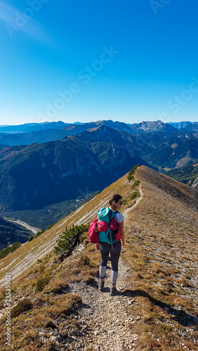 Hiker woman on idyllic hiking trail on alpine meadow with scenic view of majestic Hochschwab mountain range, Styria, Austria. Wanderlust in remote Austrian Alps. Sense of escapism, peace, reflection