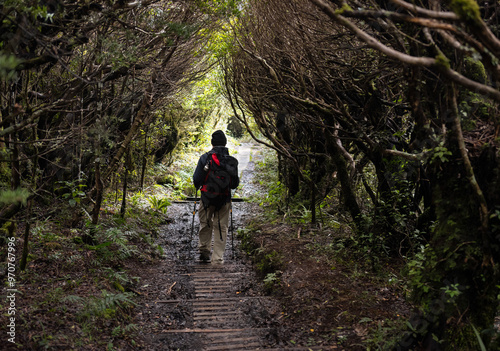 Hiking in the forest of Pouakai Crossing, Egmont National Park. New Zealand.