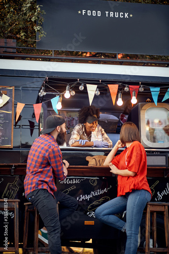 Hipster couple ordering from food truck; Urban lifestyle concept