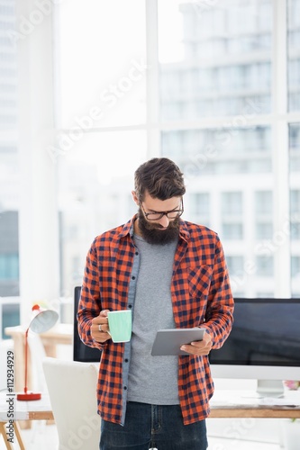 Hipster using tablet and drinking coffee