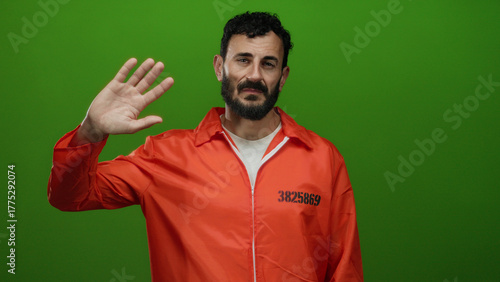 Hispanic man with beard in orange prison jumpsuit stands against green background, raising hand with somber expression, reflecting themes of imprisonment and identity.