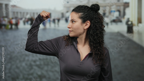 Hispanic woman with curly hair posing with arm flexed in st. peter's square, vatican, expressing strength in an outdoor urban setting with people and buildings in background.