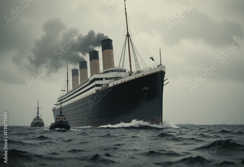 Historic large ocean liner moving through choppy waters under cloudy sky with support vessels nearby
