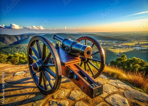 Historic signal cannon placed on a hilltop overlooking a scenic landscape during a clear blue sky