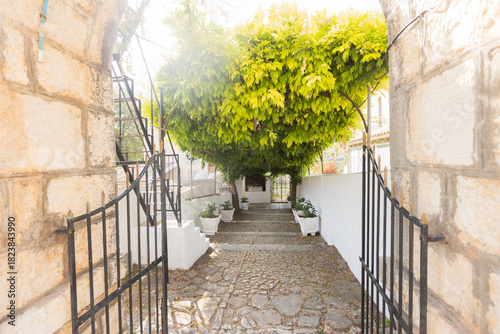 Historic stone archway and cobblestone path shaded by lush green and yellow trees