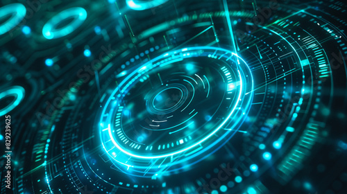 Hi-tech communication visuals enhanced by turquoise blue neon-lit circles.