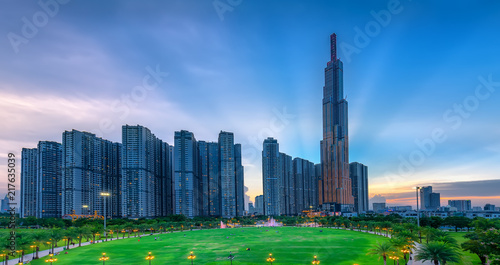 Ho Chi Minh City, Vietnam - August 1st, 2018: Panoramic skyscrapers at sunset with sky impressive in apartment, architectural extended life material development people in Ho Chi Minh City, Vietnam