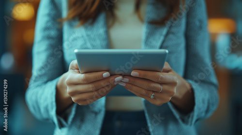 Holding a tablet with focus and intent, a person dressed in a fashionable gray blazer interacts with the screen, immersed in the technological ambiance of a modern indoor setting