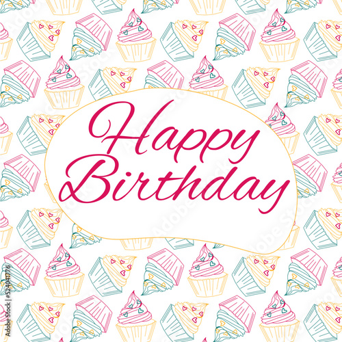 Holiday card, compliment, gift. For happy birthday event and celebration.Congratulations square card with cake pattern and lettering
