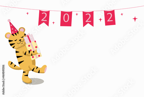 Holiday Chinese New Year, Christmas. Cartoon tiger with gifts in boxes. Symbol of the year.Vector illustration.White isolated background.