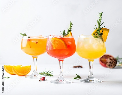 Holiday Cocktails with Orange, Cranberry, and Rosemary on White Background