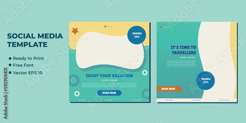 Holiday travel, traveling or summer beach travelling social media post or web banner template design. Tourism business marketing flyer or poster with abstract digital background, logo and icon.