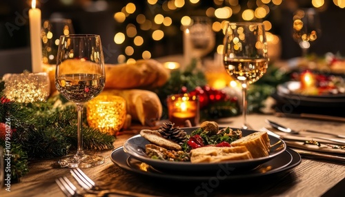 Holiday-themed table settings with vibrant decor, soft lighting, cozy holiday meal