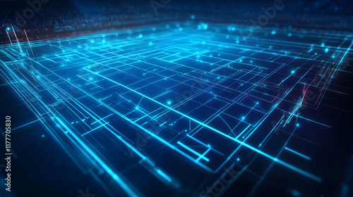 Hologram game plan. The game plan consists of polygons, triangles of points and lines. The diagram drawn on the football field is a low-poly compound structure. Technology concept vector.