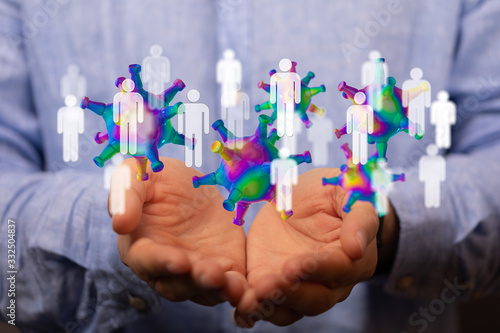 Hologram of coronavirus COVID-2019 on a blue futuristic background. Deadly type of virus 2019-nCoV. 3D models of coronavirus bacteria. Vectonic illustration in HUD style.