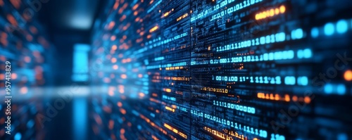 Holographic code, virtual developer tools, futuristic tech space, blue and dark tones