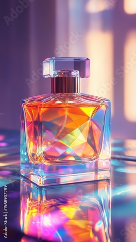 Holographic perfume bottle on reflective surface in colorful light