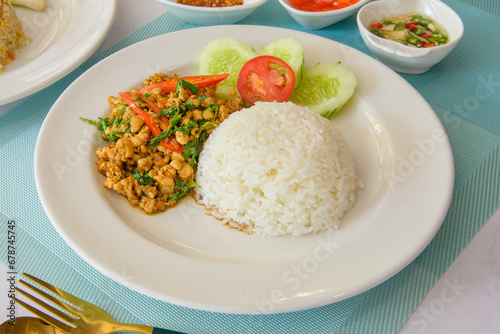 Holy basil rice with rice on a white plate