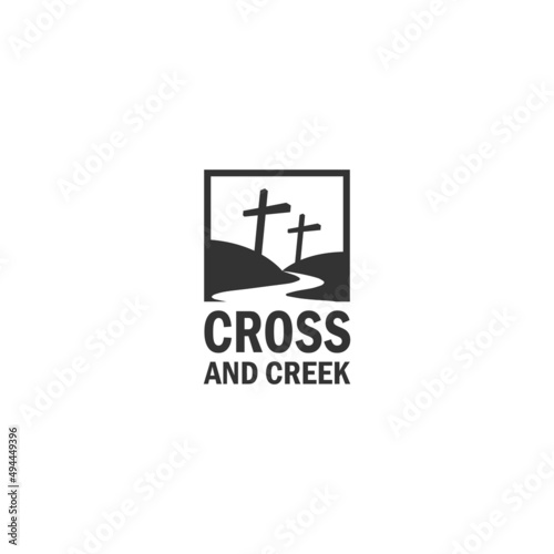 Holy christian cross with hill and river creek logo, church of Catholic in nature landscape vector illustration