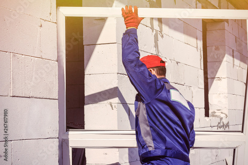 home construction loader worker carries a platic window for installation repairs