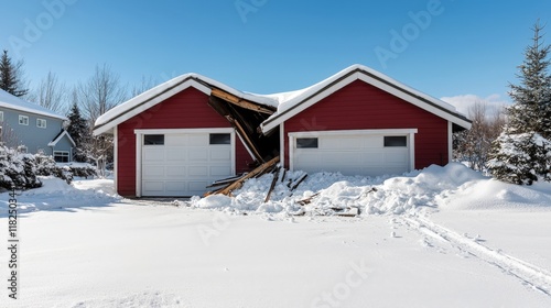 Home insurance damage and theft, A red two-car garage with a slanted roof is partially collapsed in a snowy landscape under a clear blue sky.
