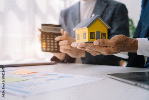 home loan officer uses a calculator with a house plan on a table.
