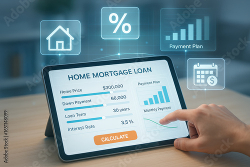 Home mortgage loan calculator digital tablet with hand pointing screen showing payment plan