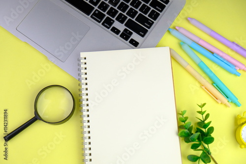 Home office workspace mockup with laptop, clipboard, palm leaf, notebook and accessories. Flat lay, top view