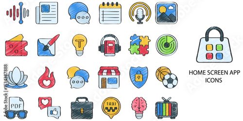 Home screen app simple concept 24 hand drawn color icons set .Vector illustration.