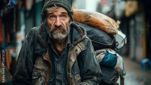 Homeless man in an alleyway, wearing ragged clothes. He has a cart full of dirty belongings behind him.