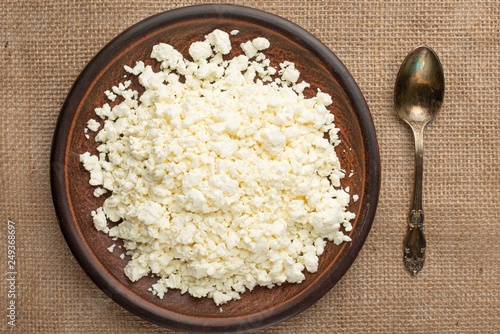 Homemade cottage cheese with raisins and candied fruits, on wooden background