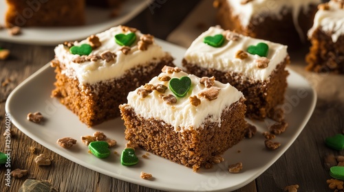 Homemade gingerbread cake squares with cream cheese frosting and green heart sprinkles, festive dessert, holiday baking, sweet treat