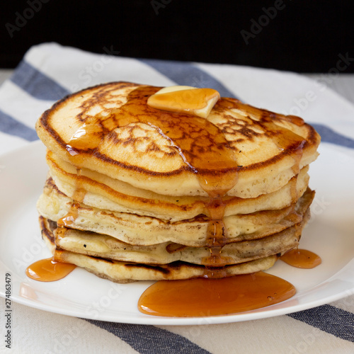 Homemade pancakes with butter and maple syrup on a white plate, side view. Closeup.
