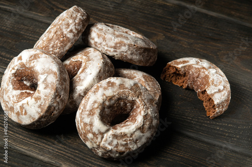 Homemade round gingerbread cookies with icing on a vintage table. Idea for a delicious