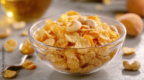 Honey cornflakes with mixed dry fruits like cashews and apricots in a bowl, surrounded by honey, spoon, and morning light