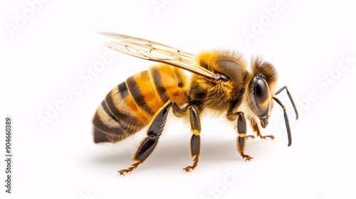 Honeybee Close-Up: A detailed macro shot of a honeybee, showcasing its intricate patterns and delicate features against a pure white background.