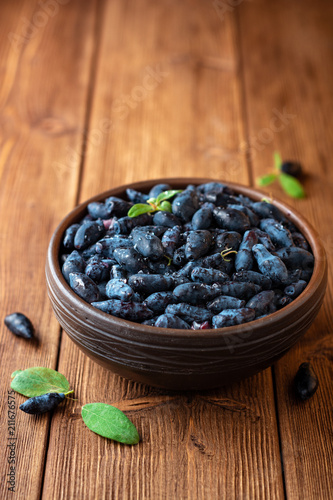 Honeysuckle berries or Lonicera caerulea in ceramic bowl on wooden background