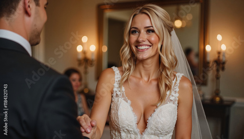 Hopeful bride Smiling bride holding hands with groom during wedding ceremony