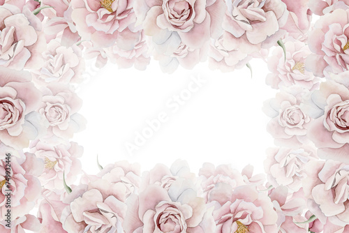 Horizontal frame of pink rose hip flowers. Victorian style. Floral watercolor illustration