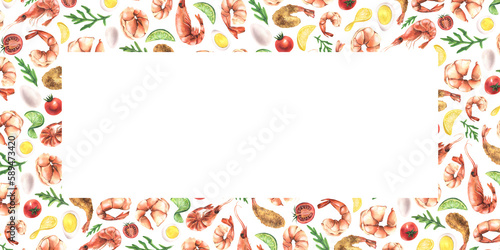 Horizontal rectangular frame empty template with white background for text, information with shrimp, greens, vegetables and eggs. Watercolor illustration hand drawn. For menus, recipes, cooking.