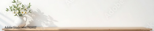 Horizontal wood frame mockup on white wall, gypsophila, furniture , minimal, table, white wall