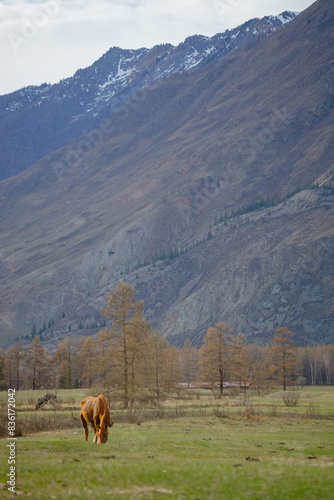 horse grazing against the backdrop of mountains