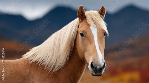 Horse with a long mane and a white face is standing in a field. The horse's face is looking straight ahead, and the background features mountains. Concept of calm and serenity