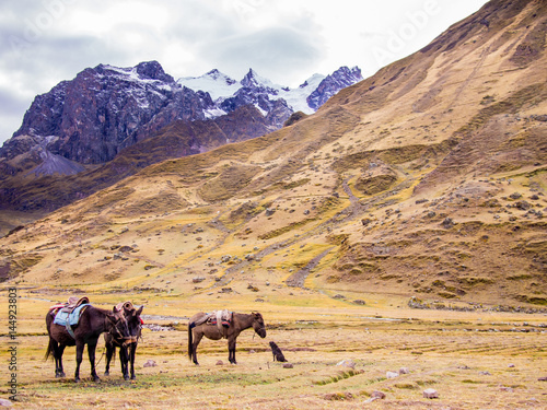 Horses & dog waiting in Andes mountains, Peru