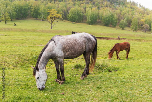horses graze a meadow in a picturesque place in the mountains. Live cattle and livestock concept