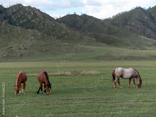 Horses with foals grazing in a pasture in the Altai Mountains