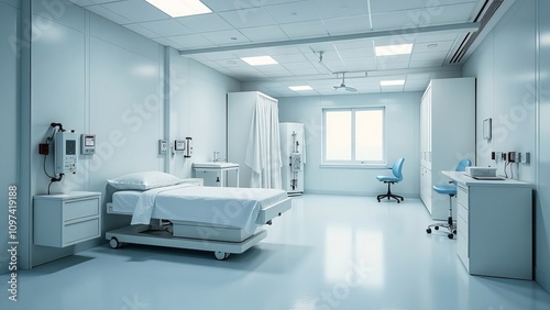 Hospital interior with bed, medical interior background white room ward with nursing care or healthcare recovery treatment